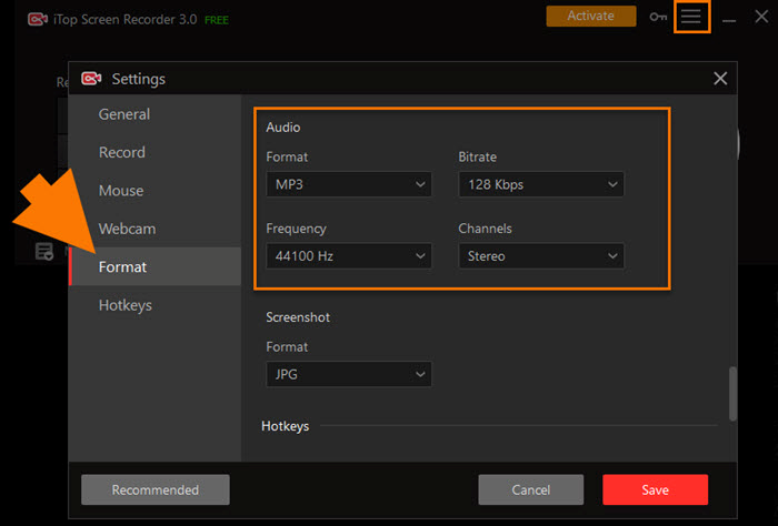 - Open iTop Screen Recorder and go to Settings > Format > Audio. Choose your preferred export format, like MP3, and adjust audio quality as needed.