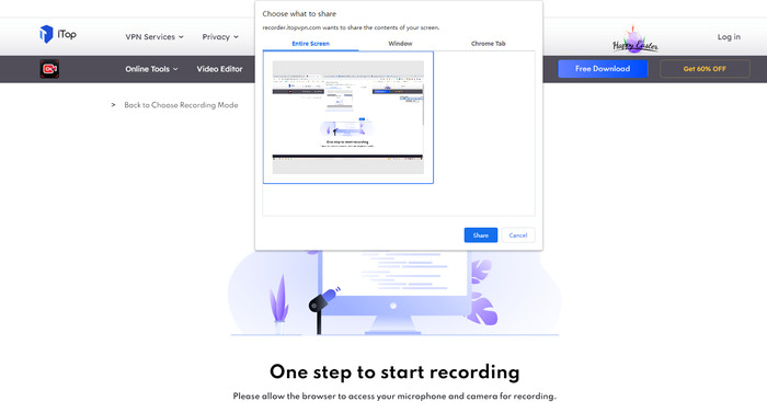 iTop Online Screen Recorder allows quick, hassle-free YouTube audio recording directly in your browser. Just visit the site, click record, and capture streaming audio easily. However, you may be limited by short recording times.