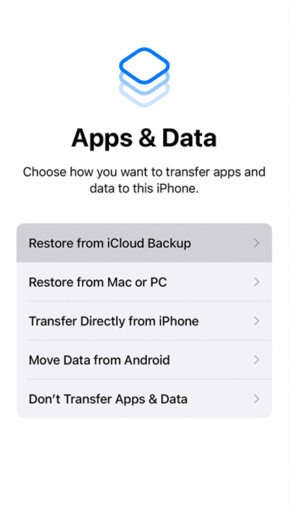 - When it asks you to choose a way to transfer data, select “Restore from iCloud”.