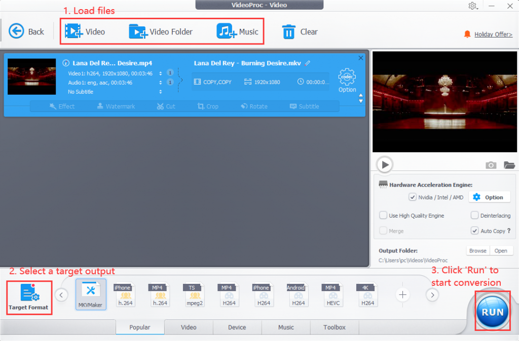 This universal converter embraces 370+ input codecs and 420+ output formats. Popular or rare, VideoProc Converter literally handle video footage from any device as easy as pie, such as GoPro, DJI, drones, camcorders, monitor units, car DVRs, DVDs, smartphones, and tablets. All you need to do is drag files in the converter and select a target format. VideoProc Converter offers you a straightforward answer to the unacceptable file format issue.