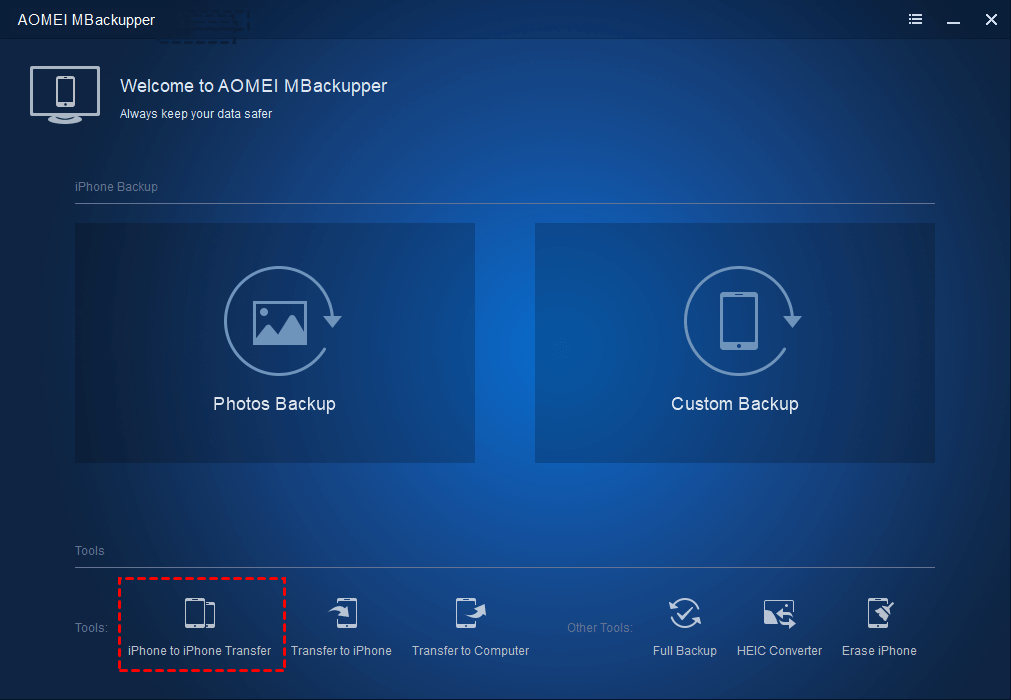 Step 1. Download and install AOMEI MBackupper and click “iPhone to iPhone Transfer” on the tools section.